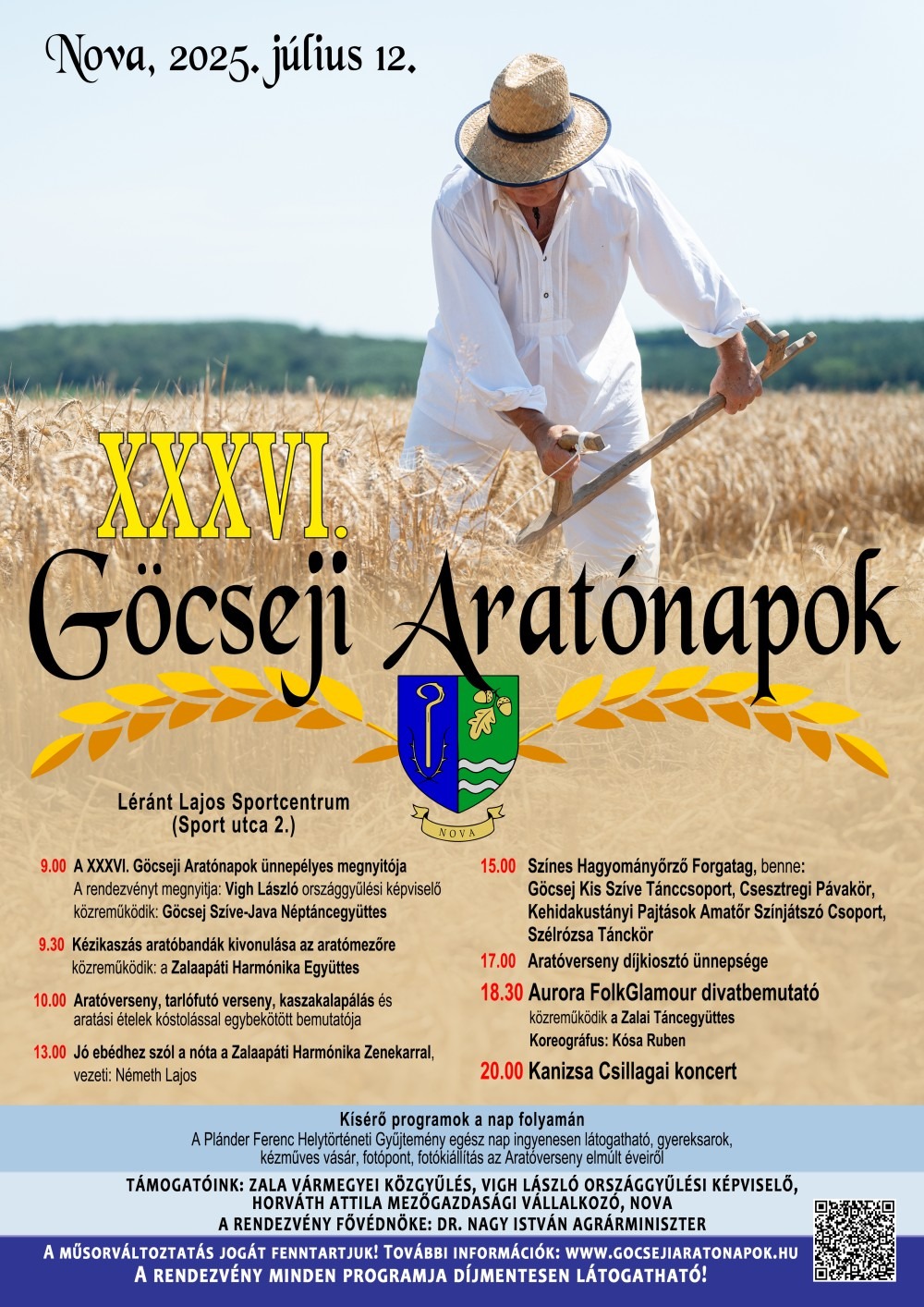 Idén már a 36. Göcseji Aratóversenyre várunk mindenkit szeretettel, ahol a múlt és a jelen újra kézfogót adnak egymásnak! A kézikaszás aratóverseny mellett tarlófutóverseny, kaszakalapálás, aratási ételek és italok bemutatója, hagyományőrző programok és koncertek színesítik a napot.